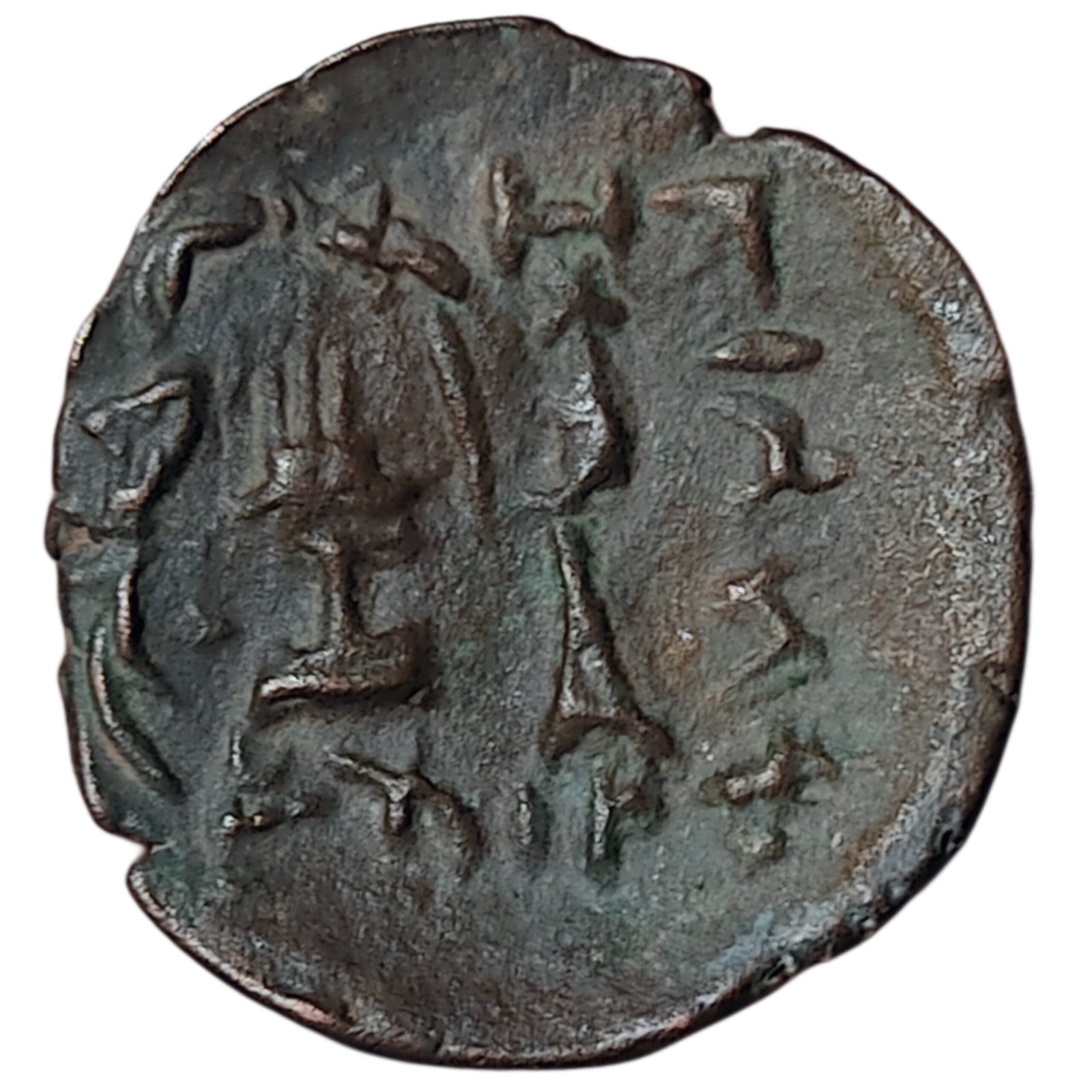 Obverse: Small bust facing left, with a short beard, wearing a diadem with three ties, a three-segmented torque, and a mural crown. A monogram appears on the right side of the bust.