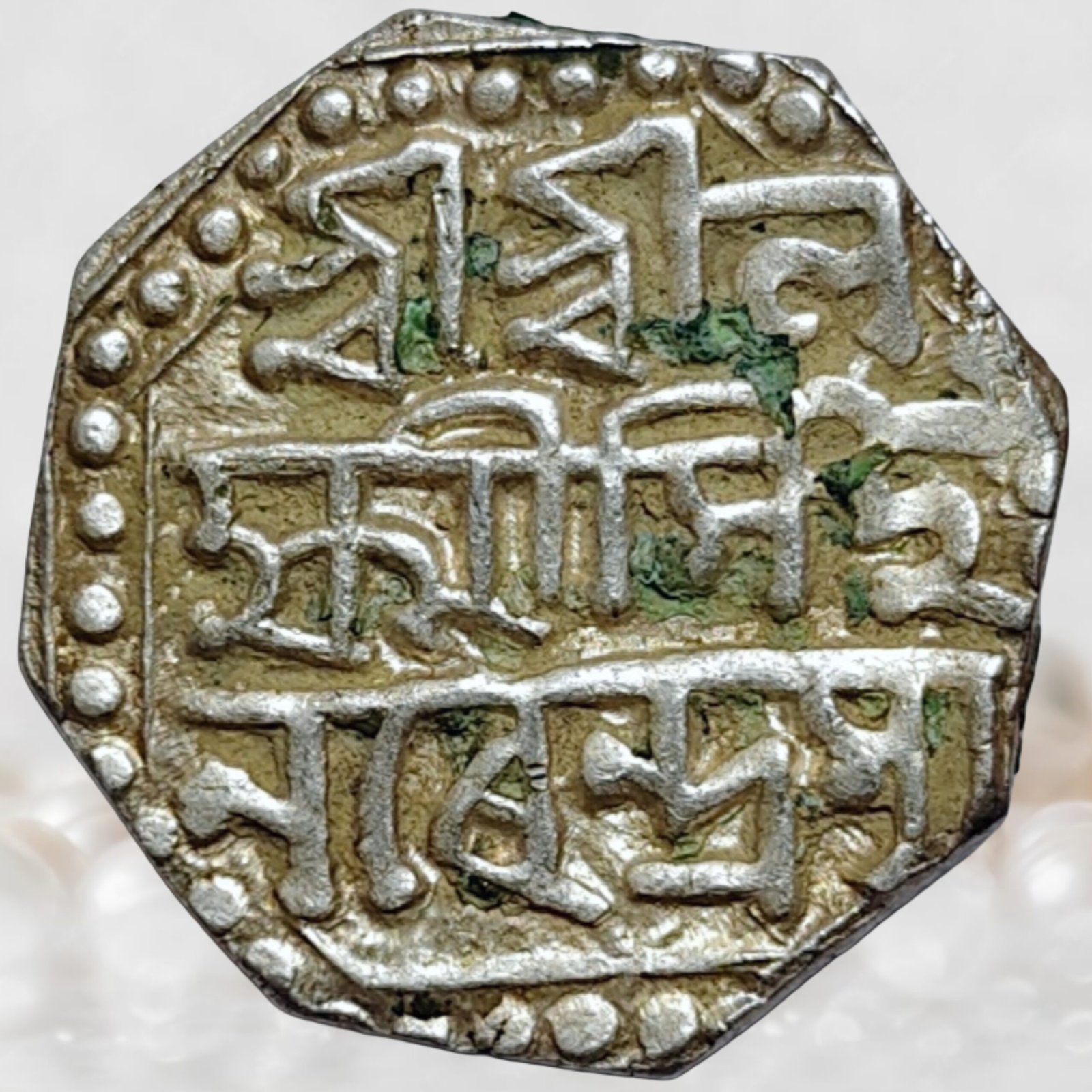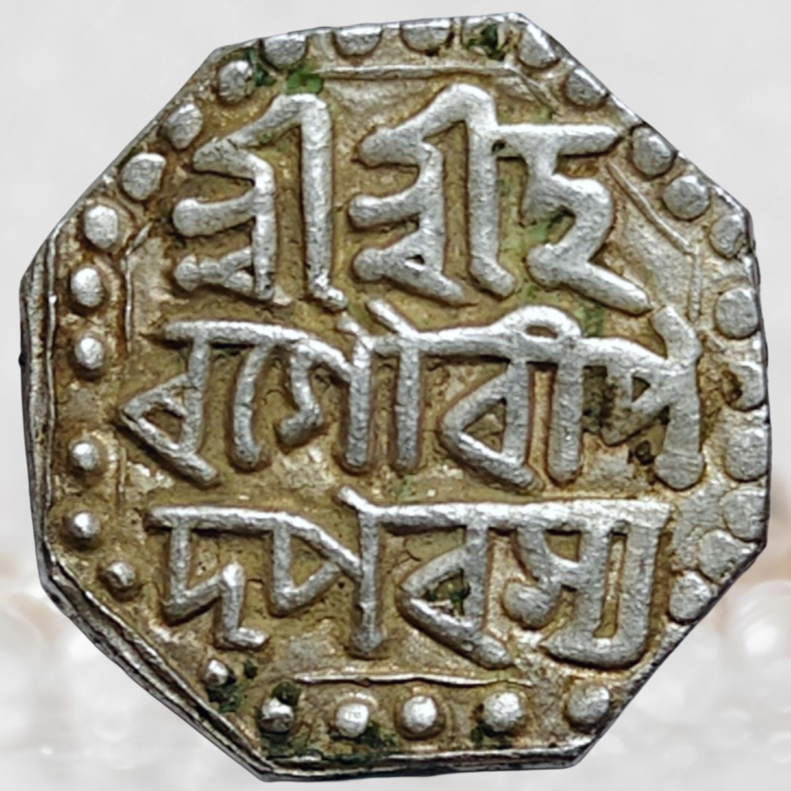 The coin belongs to the reign of Lakshmi Singha of the Ahom dynasty, ruling Assam during 1769–1780 CE, a period marked by political unrest and internal rebellion. The Ahom kingdom, which had ruled Assam for centuries, was facing Moamoria rebellion, one of the most serious uprisings that weakened central authority. Despite instability, the Ahom rulers continued to assert sovereign control and regional identity, maintaining administrative and monetary systems. This period reflects the resilience of the kingdom before eventual decline and later Burmese invasions in the early 19th century.