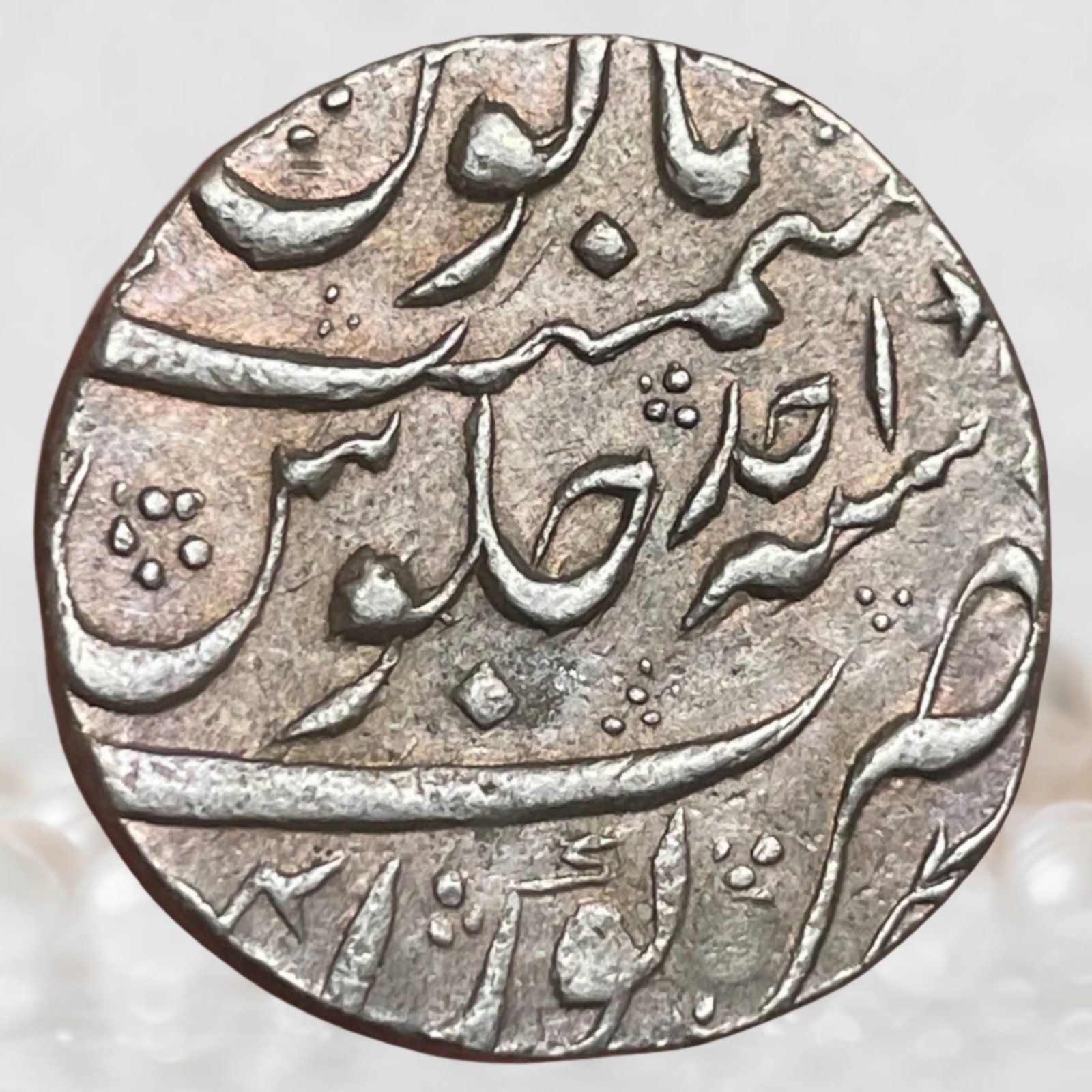 “This coin is a Safdar Jung silver Rupee struck at the Kora Mint in AH 1161 (Ahad regnal year), in near-uncirculated condition with attractive natural toning and original luster, making it a beautifully preserved and highly desirable piece for discerning numismatists”