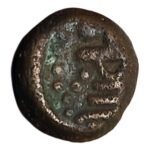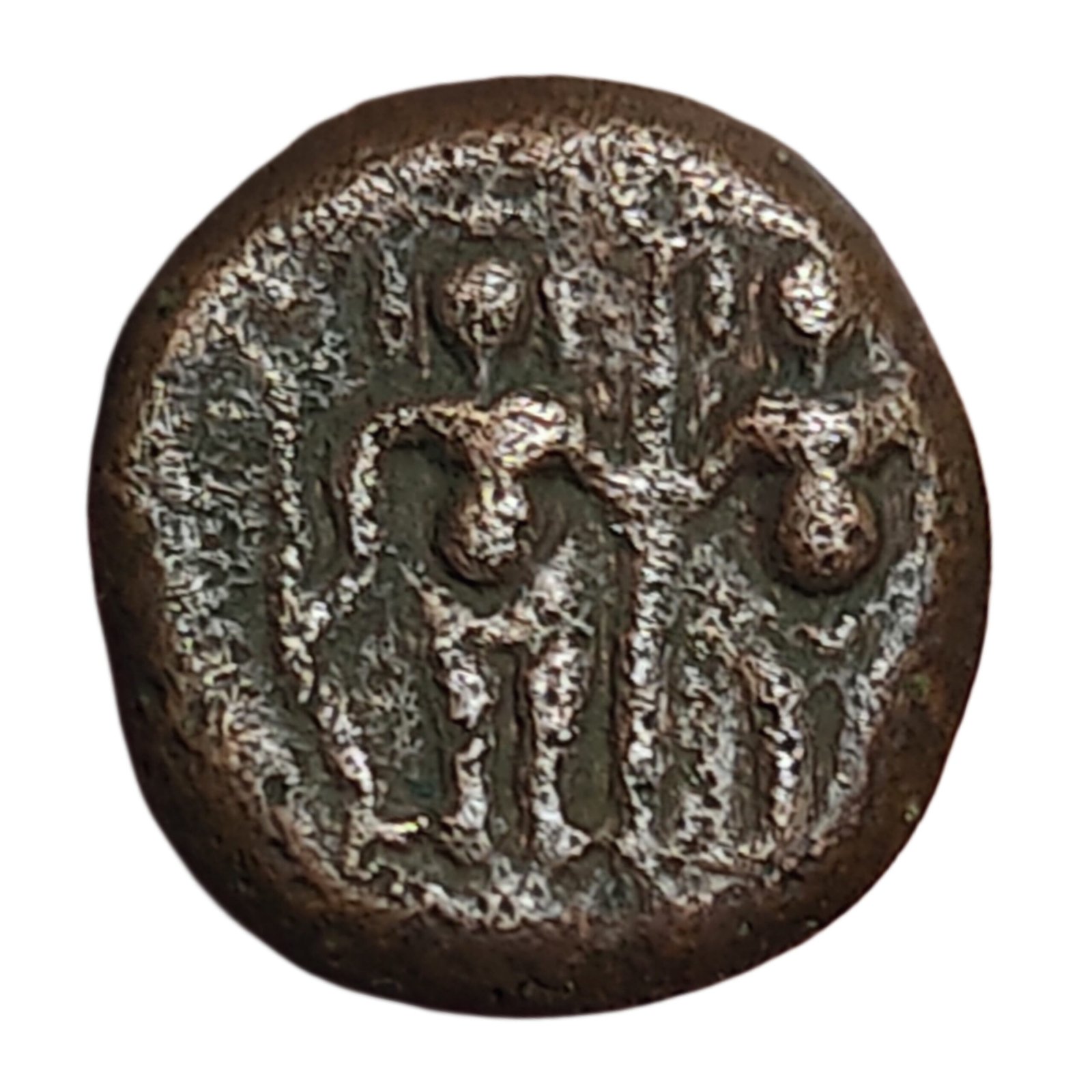 The coinage of his reign reflects deep religious symbolism. This small copper kasu depicts Lord Rama and Lakshmana on the obverse, emphasizing royal adherence to dharma and divine protection. The reverse features a lingam on an alta