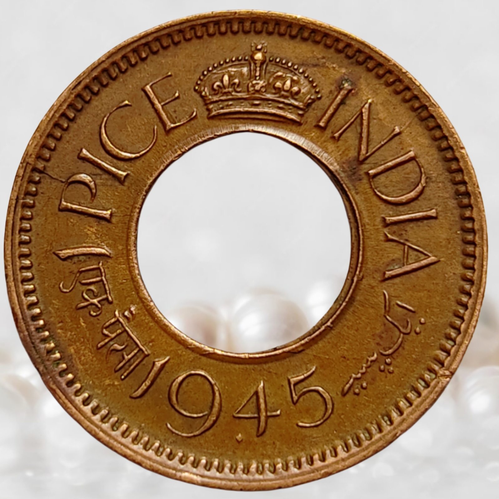 British India, Ruler: George VI, (r. 1936–1947 CE), Year of Minting: 1943–1947 CE, Denomination: 1 Pice (1/64 of a Rupee), Metal: Bronze, Weight: 2 grams, Diameter: 21.32 mm, Shape: Round with central hole, Mint: Calcutta/Bombay/Lahore/ Pretoria, Catalogue Reference: KM#533, About Very Fine.