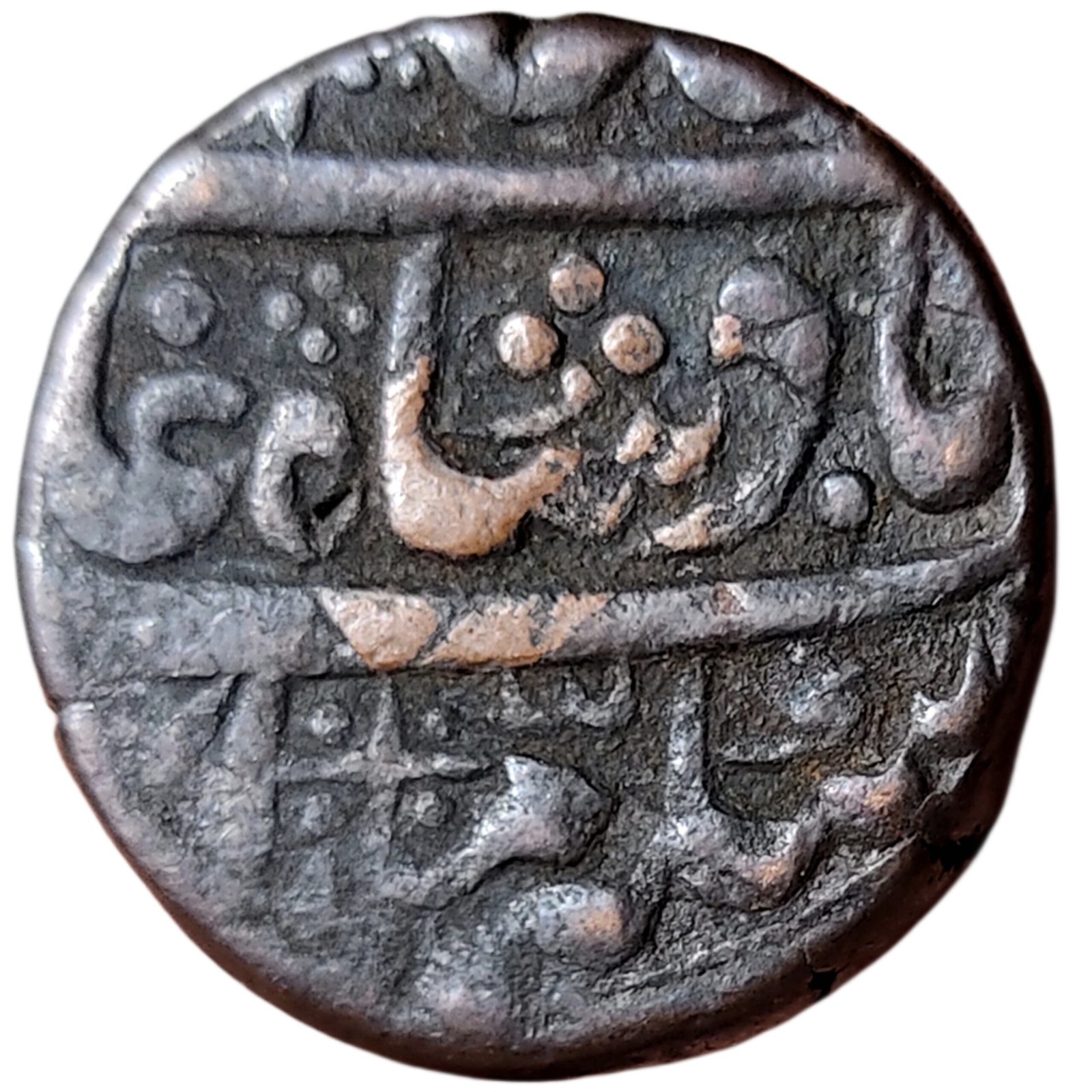 This copper takka was issued by the princely state of Bundi during the reign of Rao Raja Bishen Singh (1806–1821 CE), but in the name of the Mughal emperor Akbar Shah II to affirm Bundi’s political legitimacy under the waning Mughal authority. The coin reflects the transitional period when regional rulers maintained nominal allegiance to Delhi while exercising practical independence. Bundi, located in present-day Rajasthan, continued its traditional copper coinage with distinctive local fabric and bold calligraphy. The obverse bears the formula sikka mubarak badshah ghazi Akbar II, underscoring imperial sanction, while the reverse records maimanat manus, the 30th regnal year, and zarb Bundi. Such pieces are scarce today due to limited mint output and localized circulation.