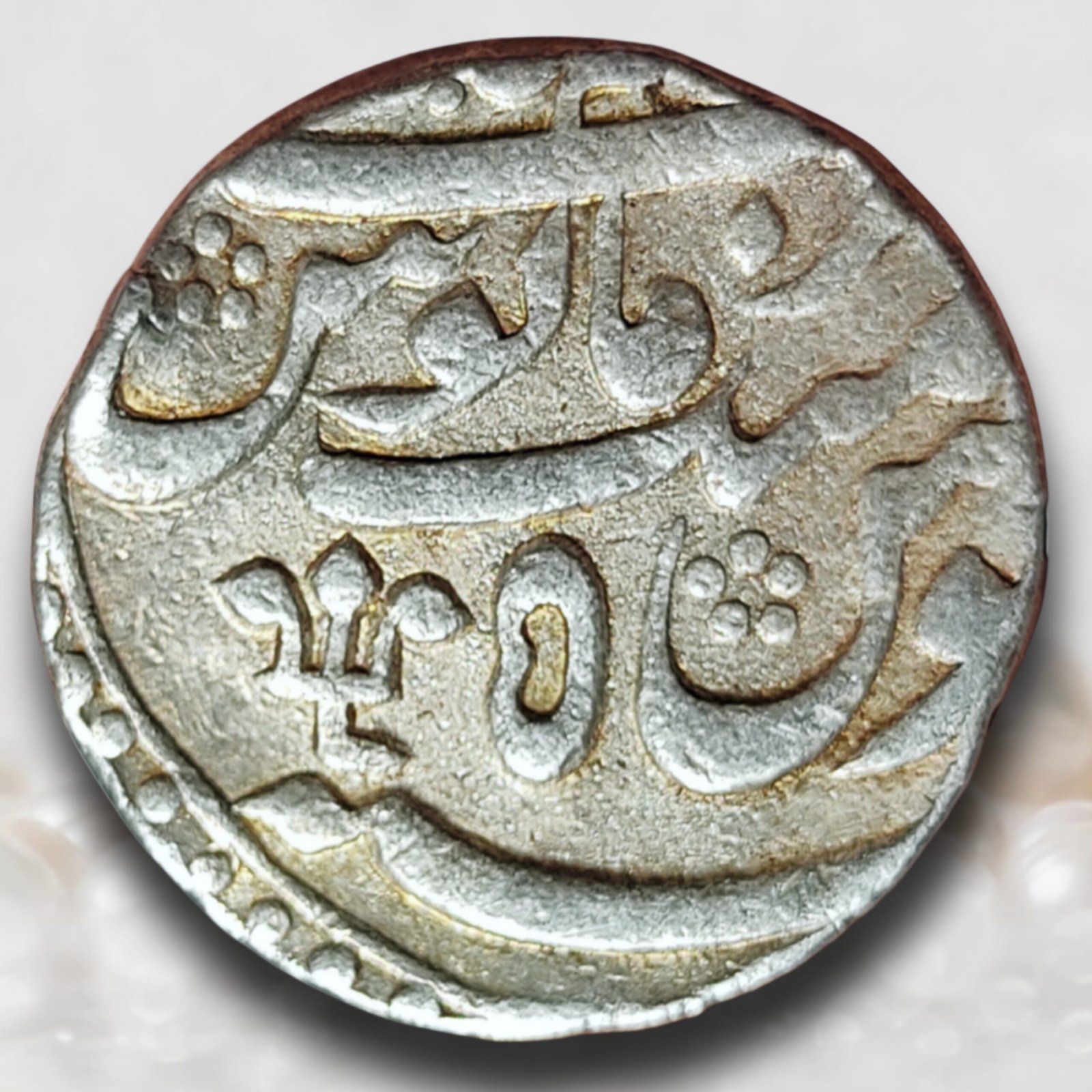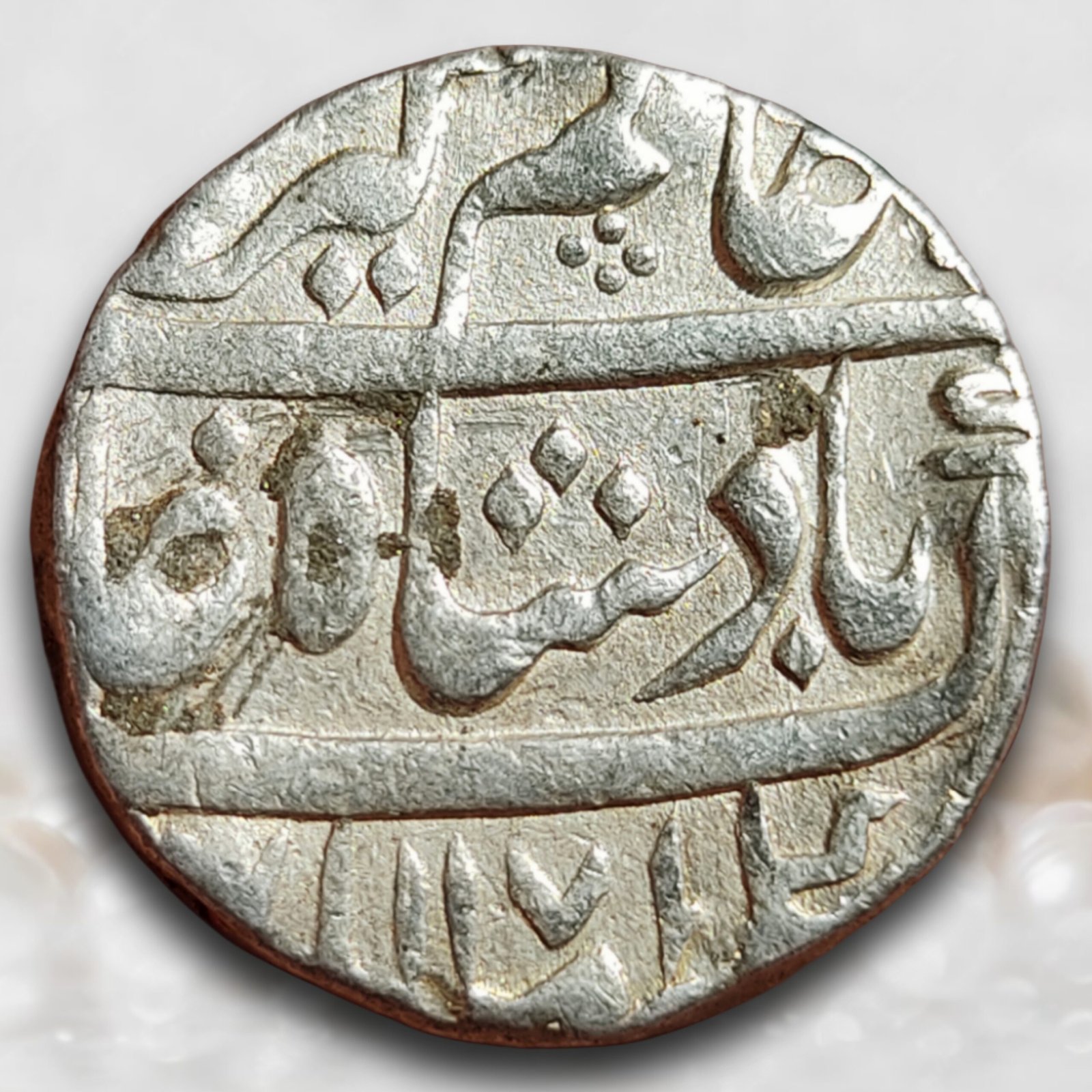 This coin belongs to the period of Syed Mir Jafar Ali Khan Bahadur, who assumed the masnad of Bengal after the Battle of Plassey in 1757 with decisive support from the British East India Company. After Plassey, Bengal entered a dual system of governance, where real power rested with the Company while the Nawab remained largely a nominal or “puppet” ruler. Mir Jafar ruled under the shadow of Robert Clive, marking the beginning of effective British dominance in Bengal. Although coins continued to be issued in the name of the Mughal emperor Alamgir II, imperial authority in Bengal was purely symbolic. The Azimabad (Patna) mint, then under Bengal’s control, struck rupees bearing the distinctive trident (trishula) mint mark—often interpreted as a local mint identifier and a regional emblem—making such issues historically important and scarce today.