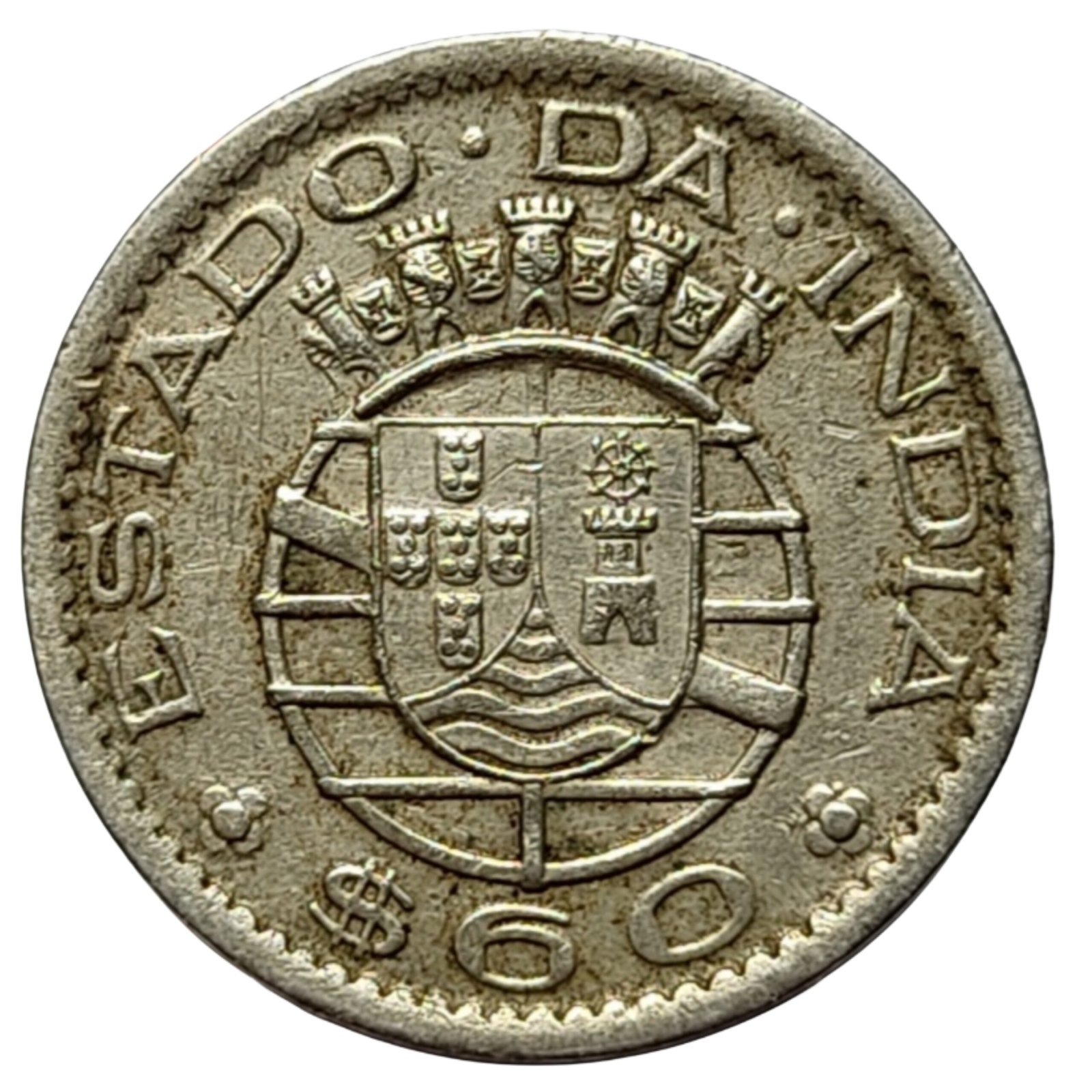 Portuguese India, 60 Centavos, Year: 1958–1959 CE, Denomination: 60 Centavos, Composition: Nickel Brass, Weight: 3.59 grams, Diameter: 20 mm, Thickness: 1.62 mm, Reference: KM #32, About Extremely Fine.