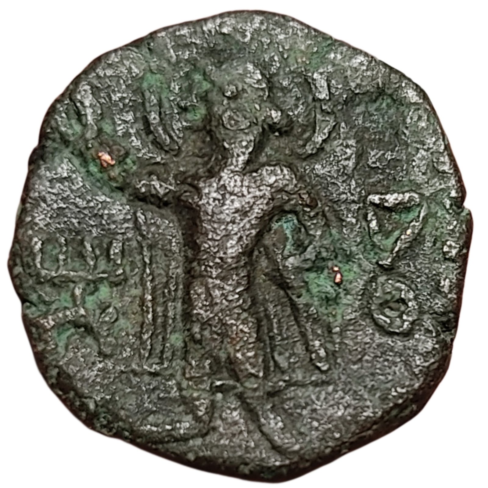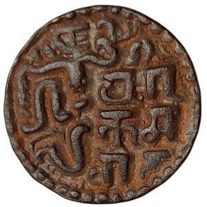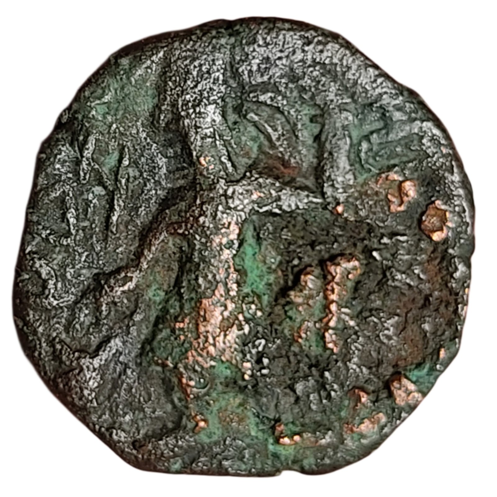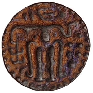 This copper ¼ unit represents the eastern or Jammu–Kashmir series of Kushan coinage, struck for regional circulation. The obverse follows the standard Kushan imperial motif of the king performing a fire sacrifice, symbolizing royal legitimacy and divine favor. The reverse depicts Oesho, identified with Shiva, emphasizing the strong Shaivite influence in the northwestern and Himalayan regions. Such coins are historically important for illustrating the Kushan synthesis of Iranian, Indian, and Hellenistic religious ideas.