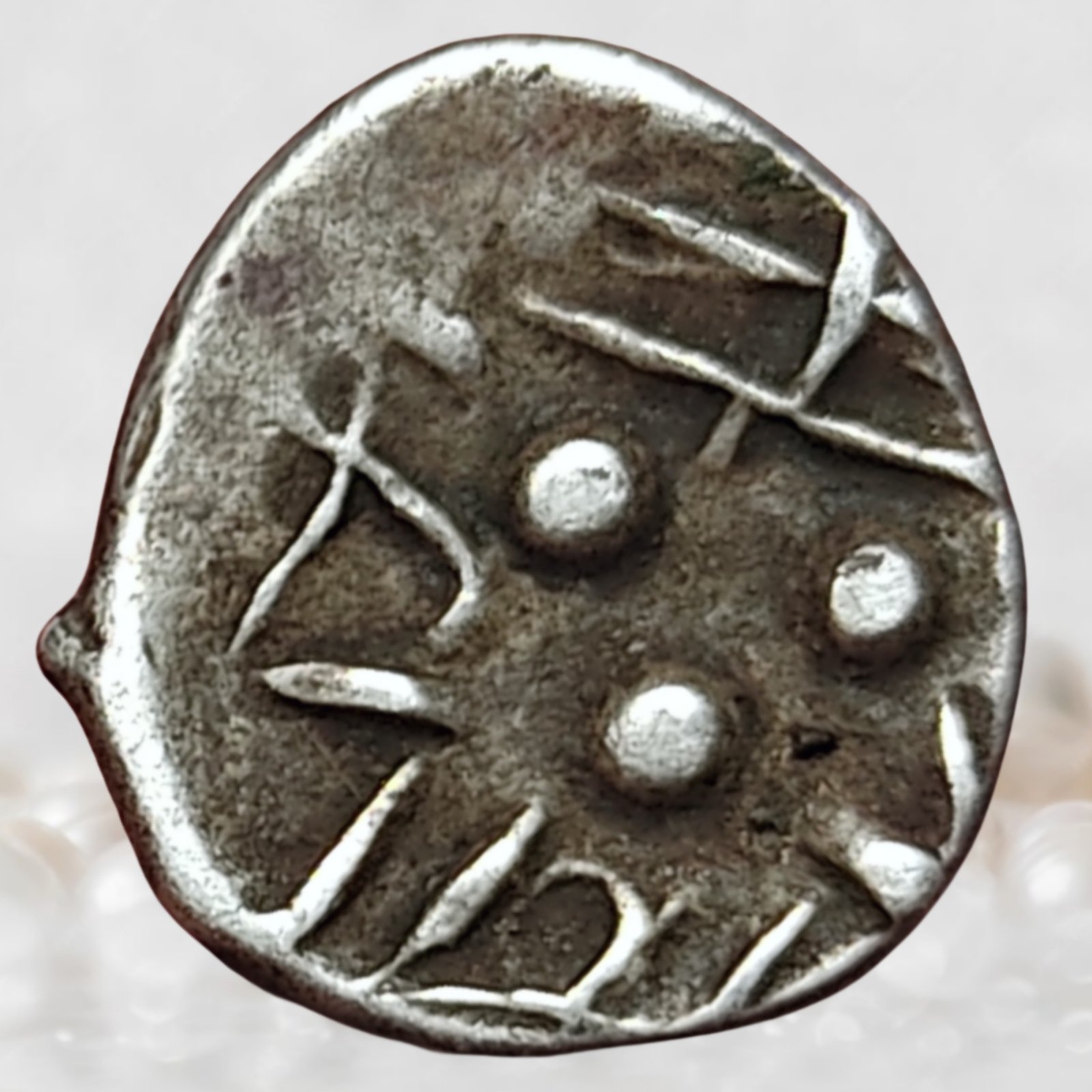 Kingdom of Sindh, Ruler: Chach of Aror, r. 631–671 CE, Denomination: AR Hemidrachm, Metal: Silver, Weight: c. 0.79 grams, Diameter: 11.43 mm, Reference: Mitchiner ACW type (Sindh series), About Very Fine, Scarce.