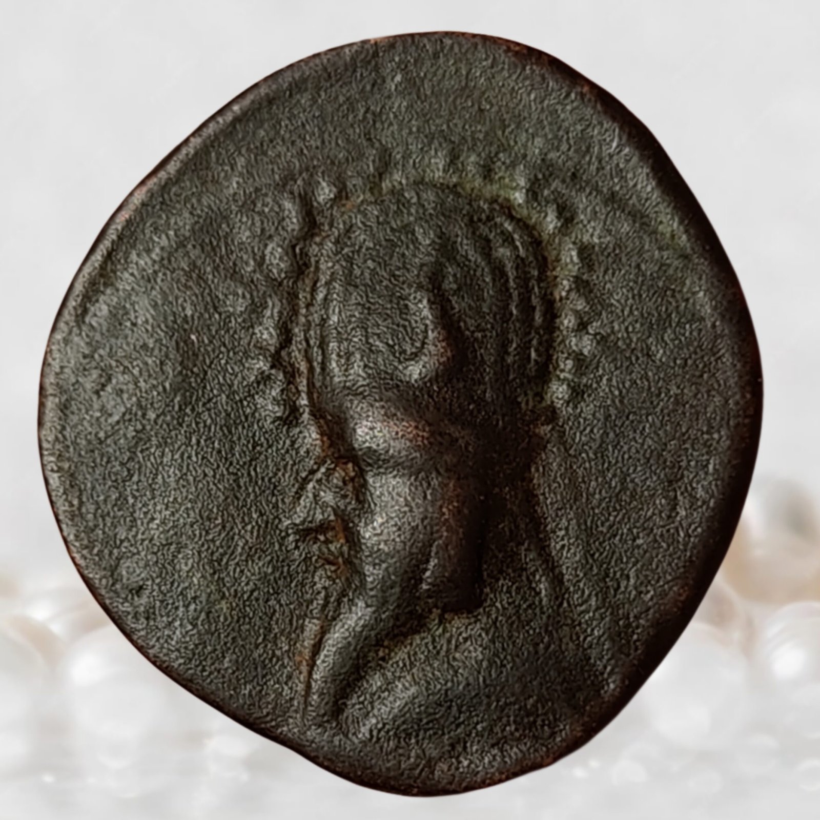 Obverse: ‘bearded bust left wearing tiara (T34i) decorated on side with fleur de lys; pellets on crest and anchor symbol erased from die; circular border of pellets’