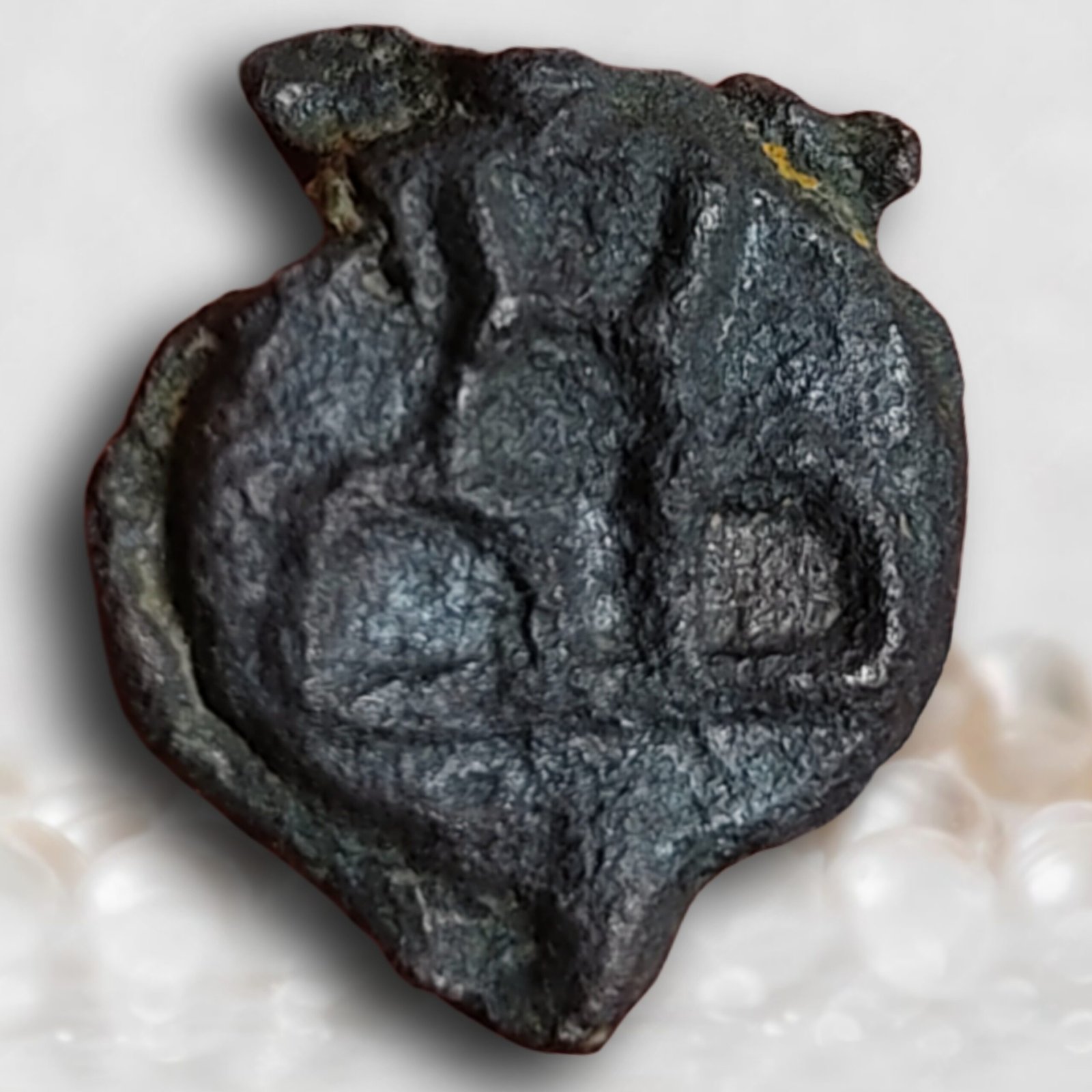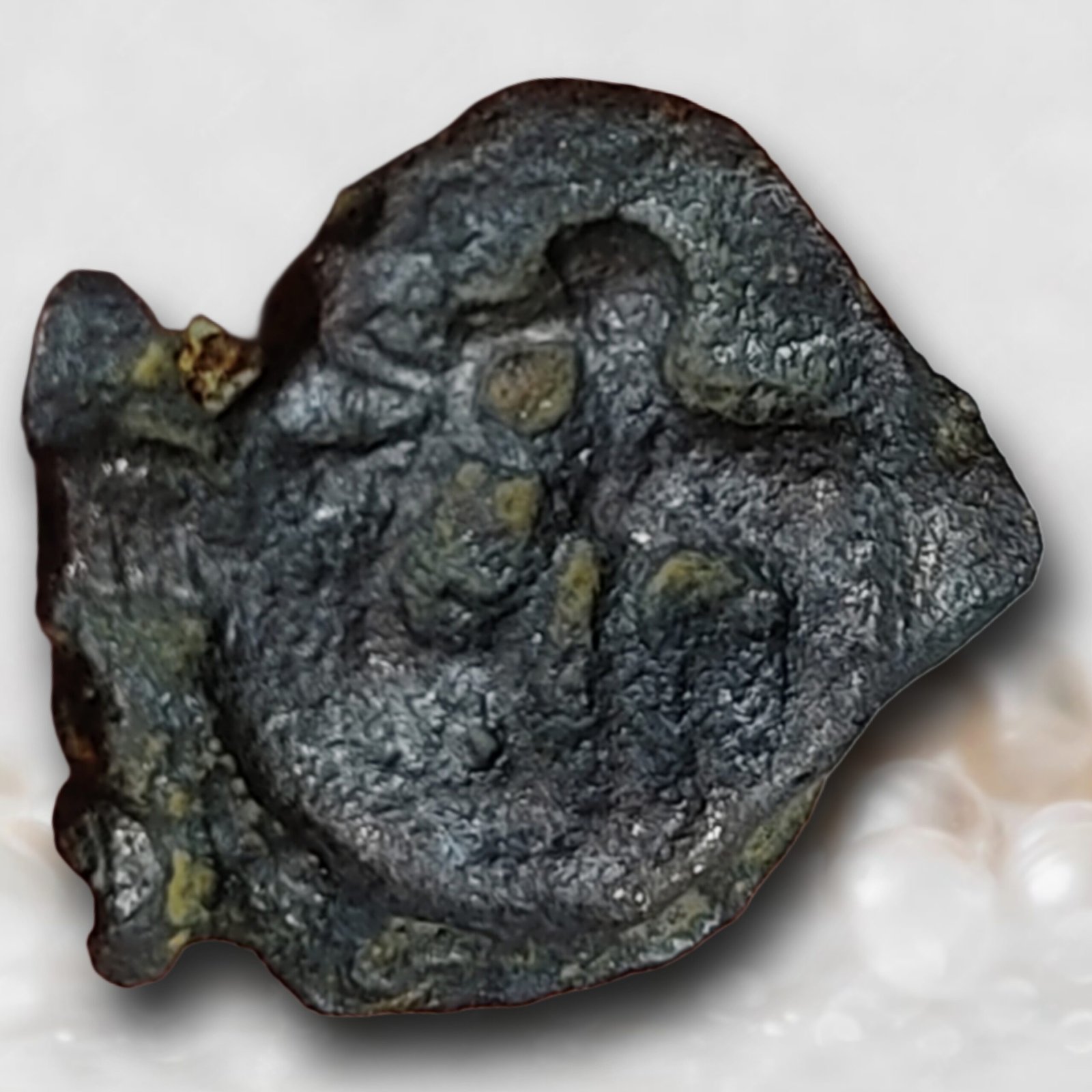 Leaf-shaped coins were locally cast rather than die-struck, indicating regional mints and semi-independent administration. The elephant on the obverse symbolizes royal power, strength, and continuity with earlier Mauryan imperial imagery, while the three-arched hill with crescent on the reverse is a common post-Mauryan motif, often associated with sacred landscapes, fertility, and cosmological beliefs. The small denomination, identified as Kakani or ¼ unit, suggests everyday circulation among common people for local trade. Such coins provide valuable evidence of economic continuity, regional artistry, and symbolic traditions during the Shunga period.