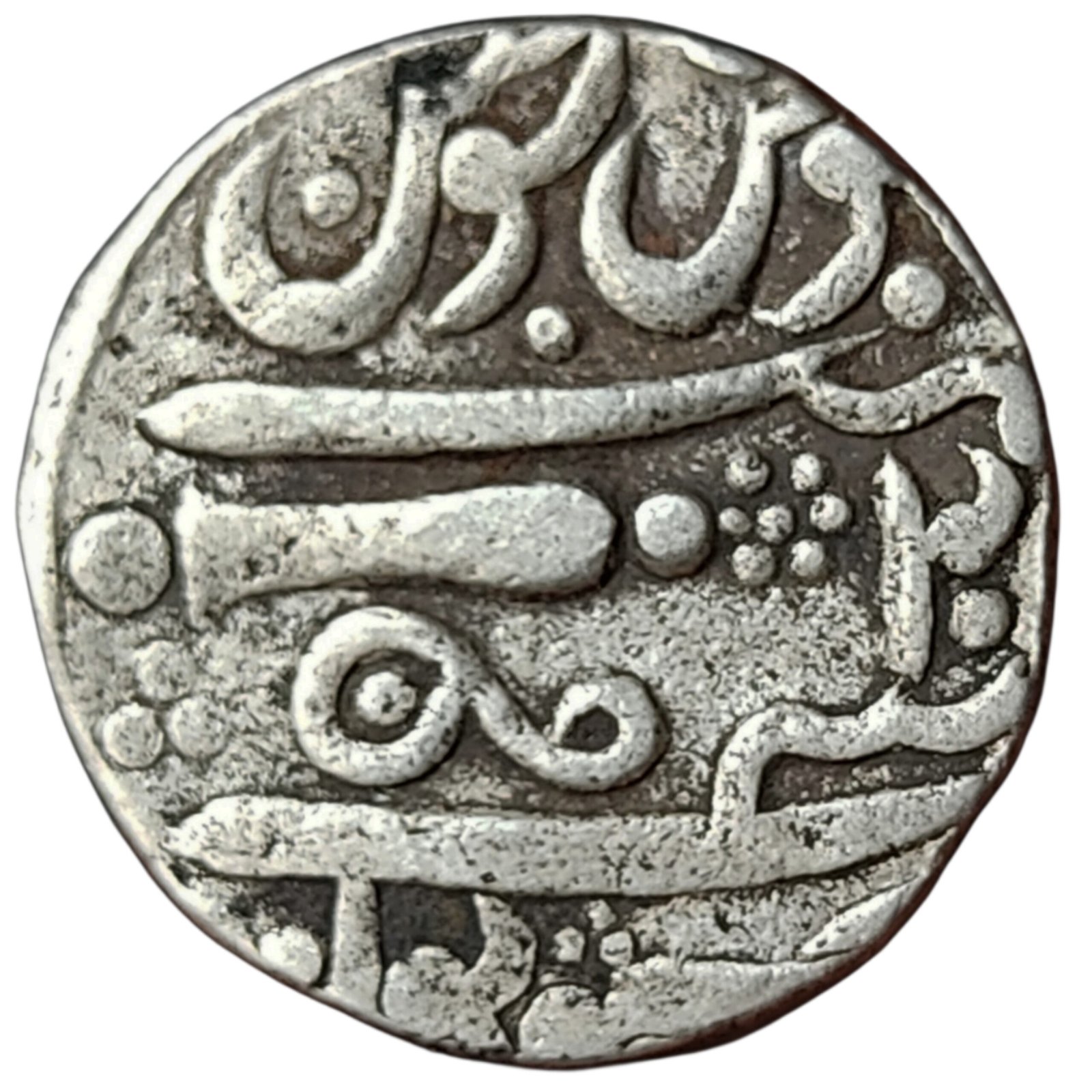 This silver rupee, struck at the Sheopur (Canon-mark) mint, bears the name of Mughal Emperor Akbar II, reflecting the tradition of Maratha states issuing coins under symbolic Mughal authority. Its elegant calligraphy and fine strike represent the rich numismatic legacy of Gwalior’s late-18th to early-19th century coinage.