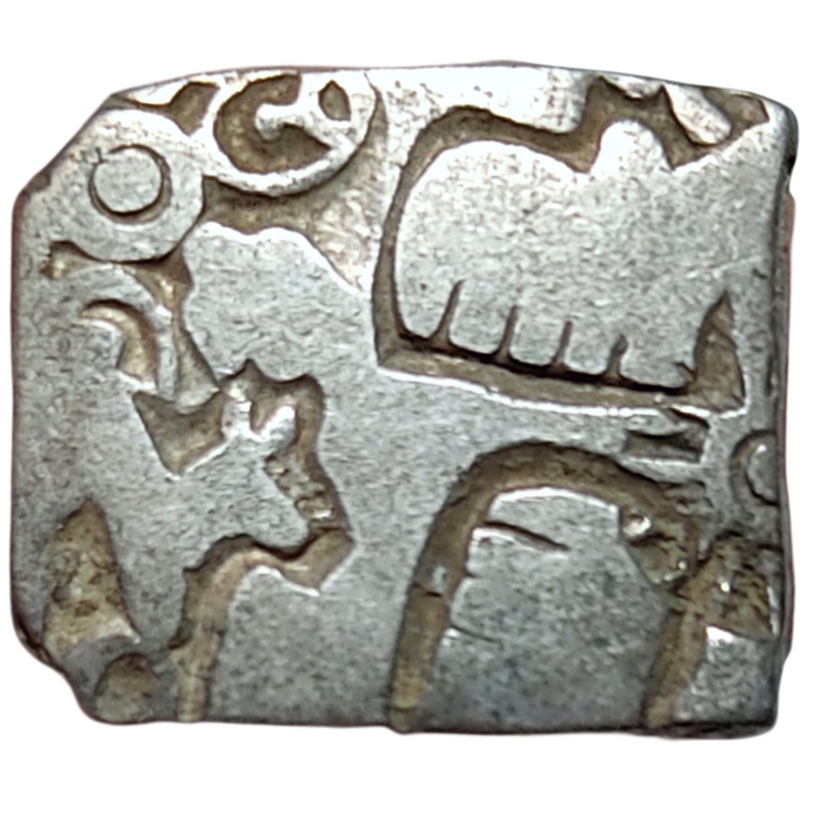 The Mauryan Empire, 322 to 185 BCE, Founded by Chandragupta Maurya around 320 BCE, Punch Marked Silver Coin, Karshapana, Magadha Janapada, Silver, 3.39 grams, 16.21×14.05mm, Fine, Rare.
