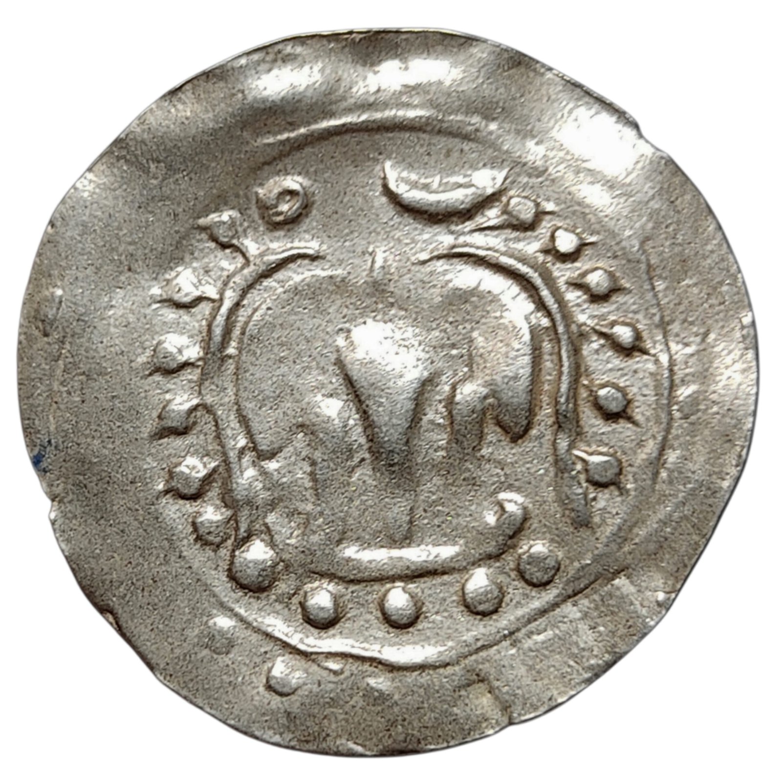 The Chandra Dynasty of Harikela, ruling during the 7th–8th century CE, oversaw a thriving coastal realm in Eastern Bengal, Arakan, and the Chittagong region. Under their authority, Harikela evolved into a major maritime hub connected to the Bay of Bengal trade networks linking Bengal with Sri Lanka, Southeast Asia, and early Arab merchants. The Chandras promoted political stability, agrarian expansion, and strong Buddhist patronage, which collectively shaped the region’s cultural identity. Their coinage reflects this prosperity: the recumbent bull on the obverse represents strength and wealth, while the bold Shrivatsa on the reverse stands as a sacred symbol revered in both Vishnuite and Buddhist traditions. These rare silver units capture Harikela’s economic vitality and its wider influence in early medieval Bengal.
