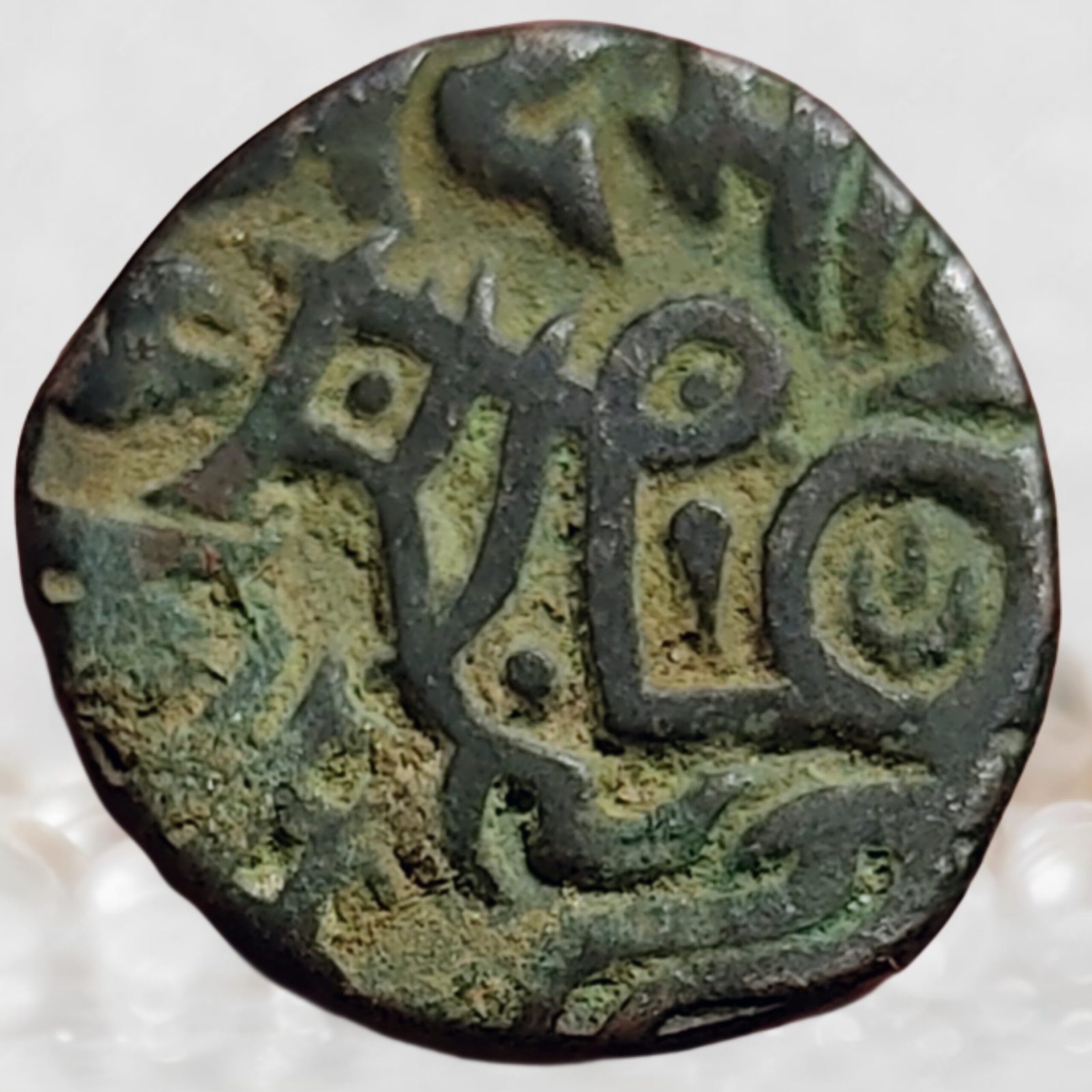 Obverse: Humpbacked bull seated left, circular pellet in hump and brisket, long mark (possibly the number “1” on jhula (saddle cloth), and stylized chandrabindu-shaped trishula (sacred trident) on rump, dotted border, Nāgarī inscription surrounding bull.