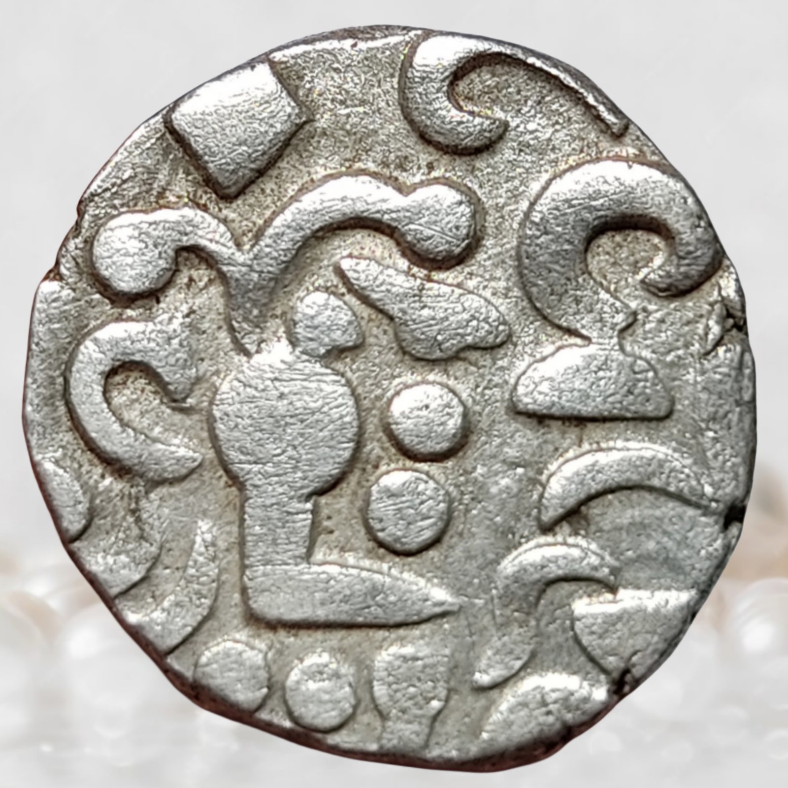 This silver drachm belongs to the Indo-Sasanian monetary tradition, a long-lasting coinage style in the Indian subcontinent inspired by original Sasanian silver issues. Although the Sasanian Empire never ruled Bengal, their silver standard and coin iconography remained influential for centuries due to trade prestige and monetary familiarity. By the early medieval period, especially during the Pala era in Bengal, these designs had become heavily abstracted, losing their original Persian inscriptions and figural clarity. Such coins were not official royal issues of the Pala kings, but rather anonymous regional issues that circulated within Pala-controlled territories. Their continued use reflects economic continuity rather than political control, making them an important witness to cultural and monetary transmission across regions.