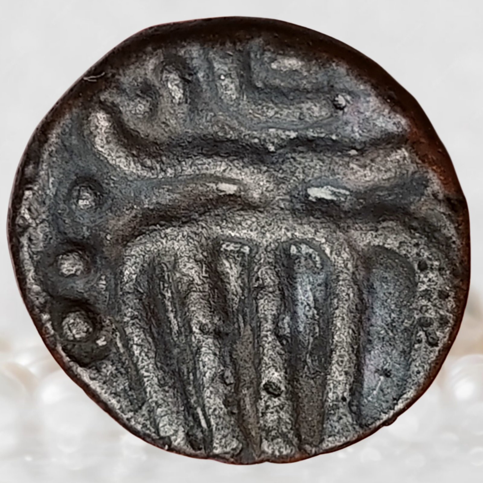 The Perunjinga Pallavas of Sendamangalam ruled parts of South India, particularly in the Tinnevelly region, during the 13th century (1228–1278 CE). As minor chieftains and feudatories of the later Chola dynasty, they issued distinctive copper coinage like this 1 Kasu. The obverse features a sacred bull (Nandi) facing right with a crescent moon above—symbols of Shaivism, reflecting the dynasty’s religious affiliation. The reverse shows a standing king, inspired by Chola coinage, signifying continuity and allegiance to Chola sovereignty. These coins highlight the regional assertion of power and the cultural-religious influence of the Cholas during a period of political transition.