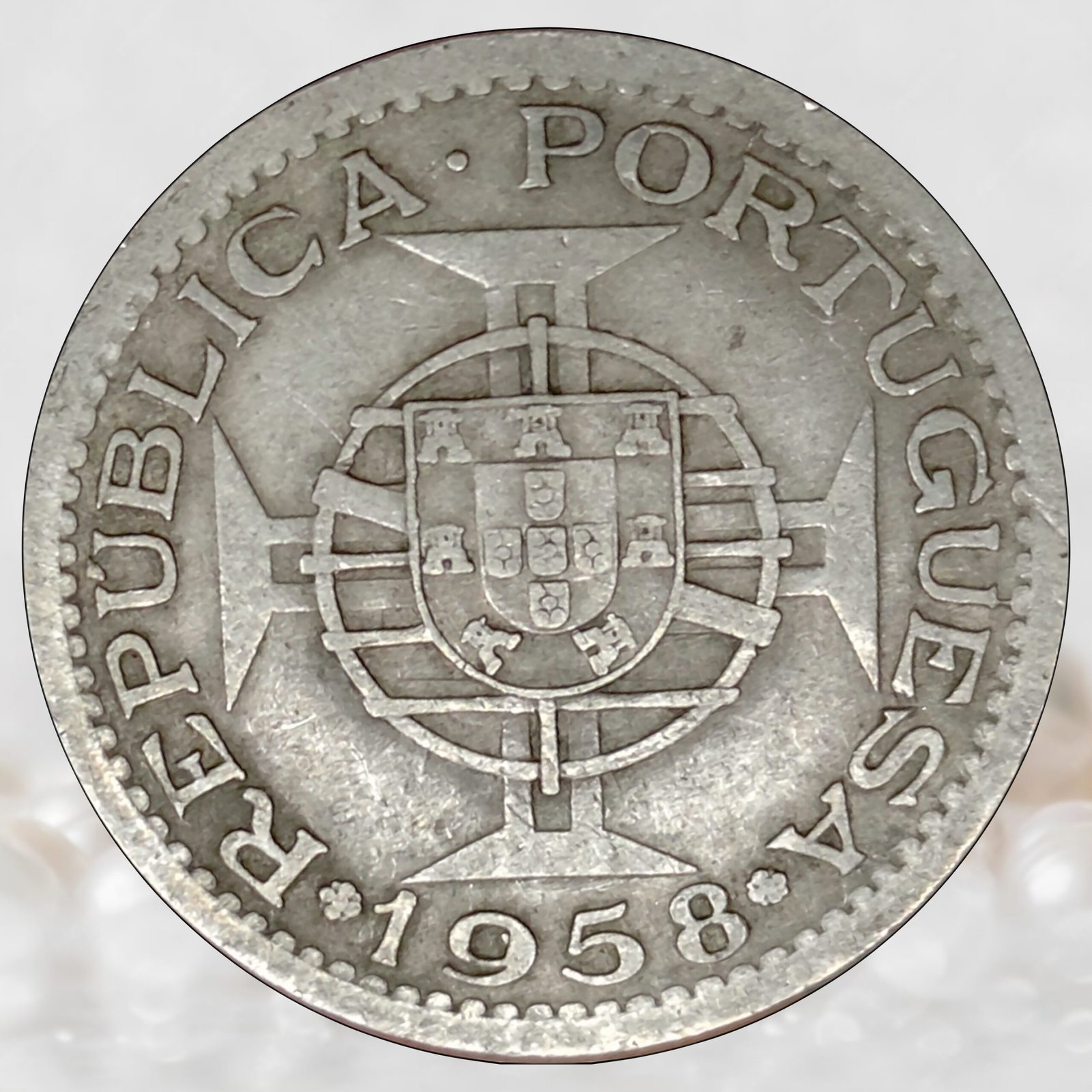 1 Escudo of Portuguese India, Year: 1958–1959 CE, Denomination: 1 Escudo, Metal: Nickel brass (Copper-Zinc-Nickel), Weight: 5.63 grams, Diameter: 24.5 mm, Reference: KM #33, Gomes# R 16, Schön# 21, About Very Fine.