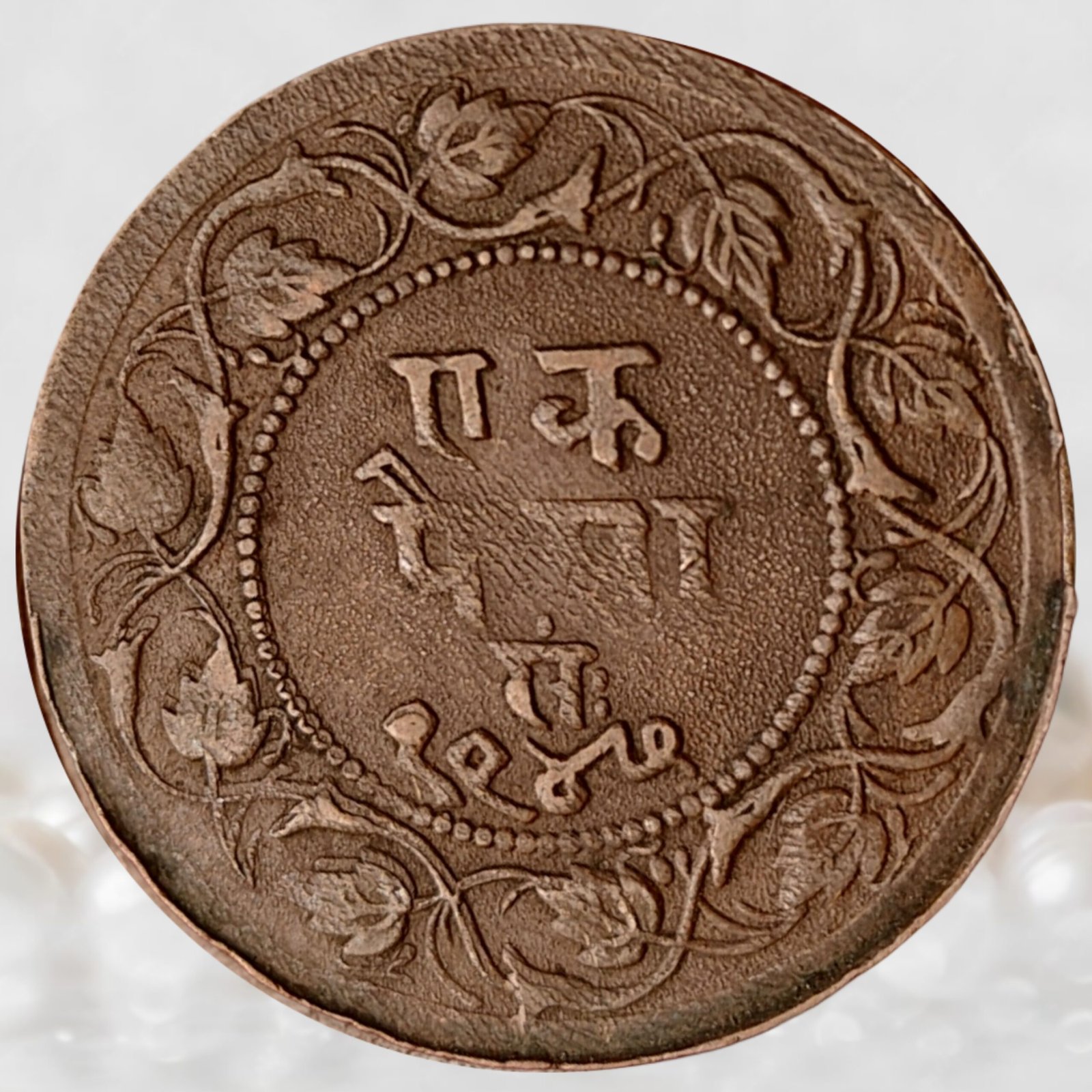 Reverse: Beaded circular border enclosing Devanagari legend “एक पैसा सं १९४७” (Ek Paisa, Samvat 1947) within floral design.