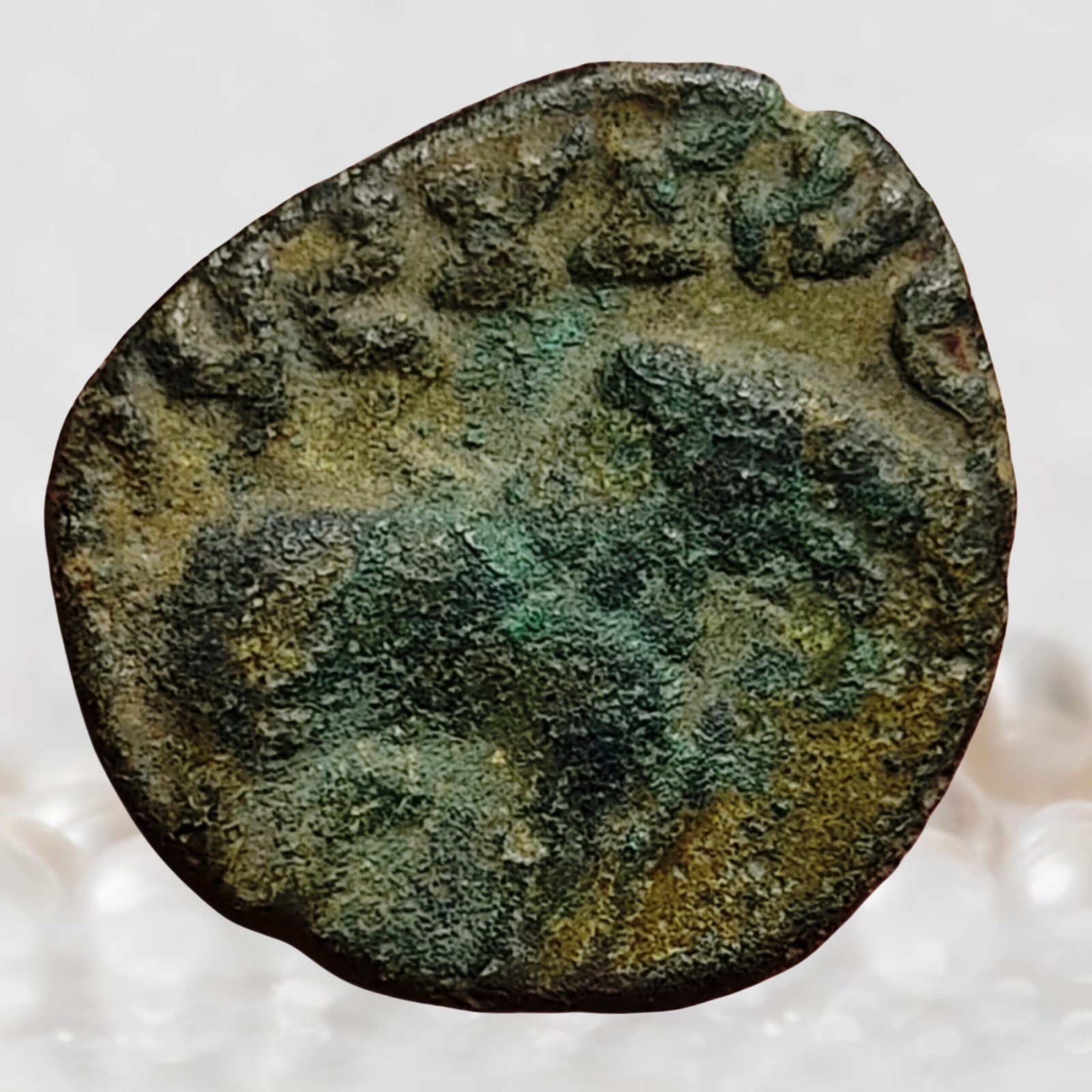 Sri Pulumavi (110–152 CE) was one of the prominent rulers of the Satavahana Empire, which flourished in the Deccan region of India. He was the son and successor of the famous ruler Gautamiputra Satakarni. Under his reign, the empire maintained its prosperity, trade, and maritime connections with Rome and Southeast Asia. The coin, featuring an elephant with a raised trunk, symbolizes strength and royal power, while the reverse with the Ujjain symbol reflects Satavahana authority and religious significance. His rule marked a period of stability, artistic growth, and cultural expansion across central and southern India.