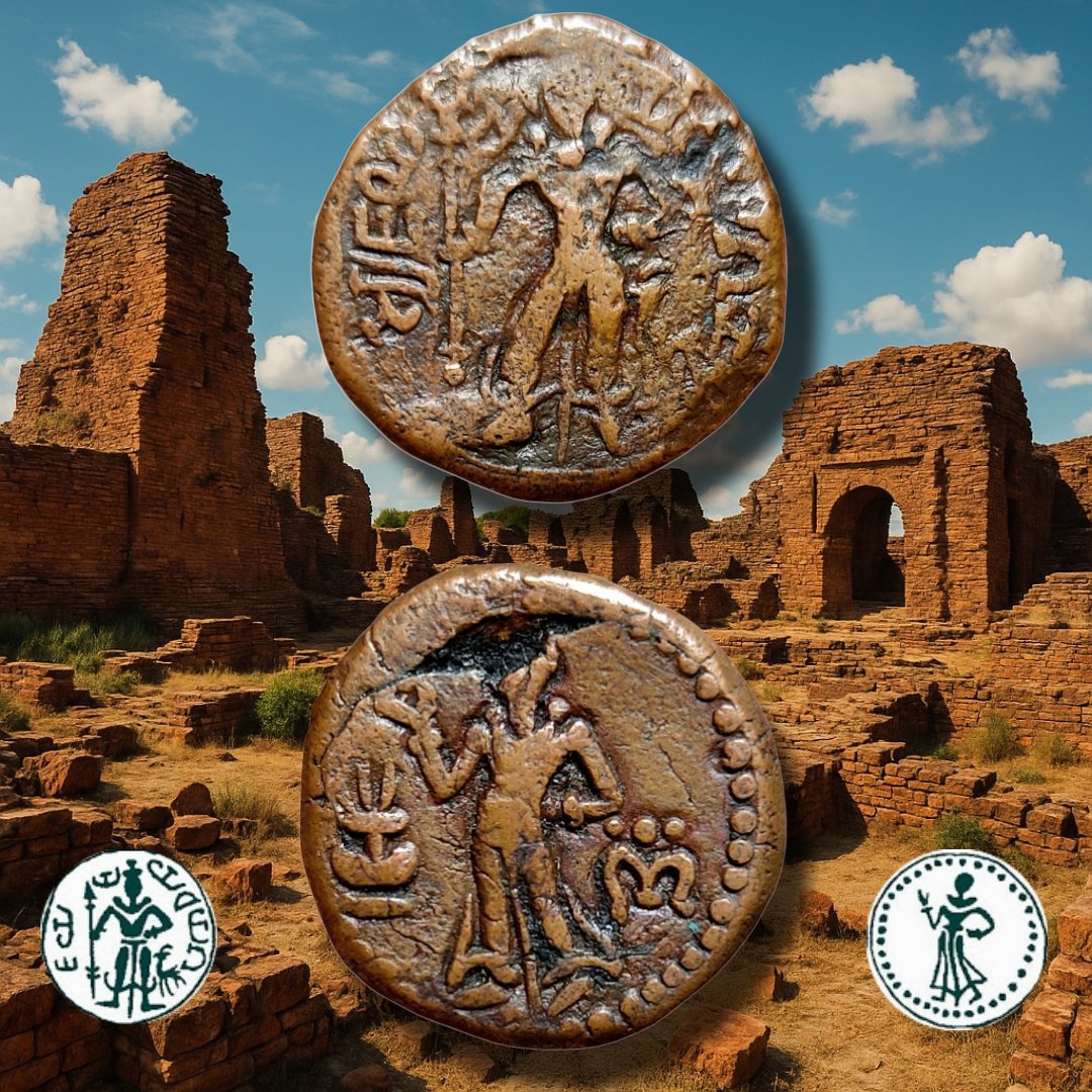 The Yaudheyas are best known through their copper coinage issued mainly during the early centuries CE, prominently depicting the war-god Kartikeya (Skanda) with his spear and peacock. The Brahmi legend “Yaudheya Ganasya Jaya” (“Victory of the Yaudheya Republic”) symbolizes their military pride and collective sovereignty.